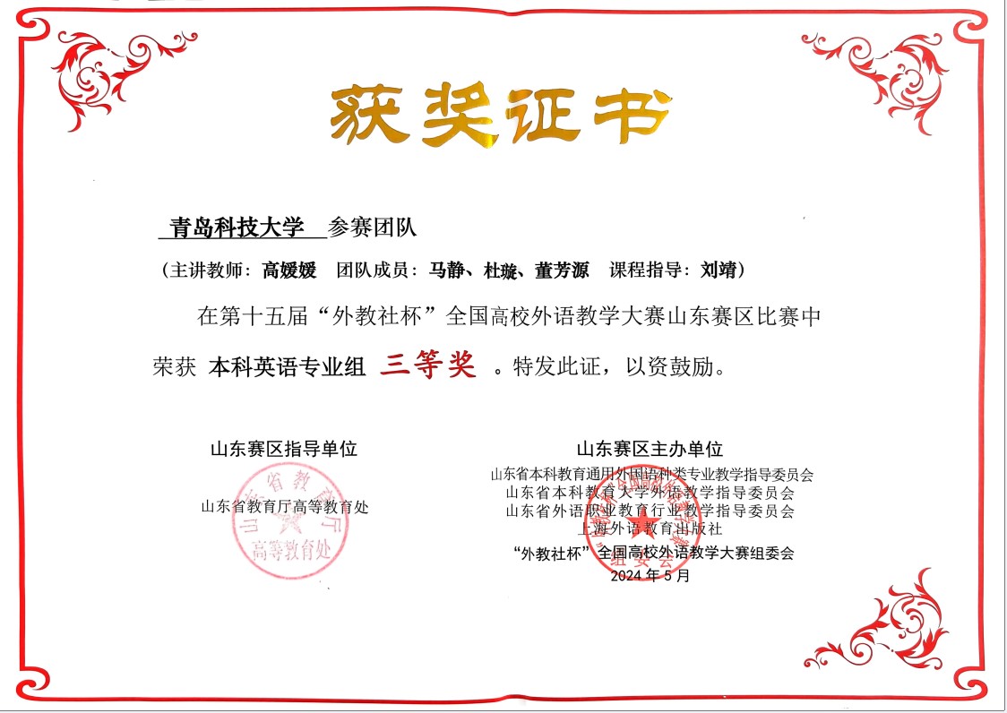 第十五届“外教社杯”全国高校外语教学大赛(山东赛区)三等奖